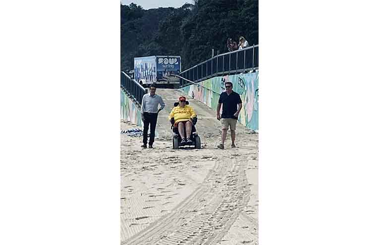Joining Michael on his first foray onto the sand at Flynn’s Beach were local disability advocates, as well as Mayor Adam Roberts, Deputy Mayor Nik Lipovac, State MP Robert Dwyer, and Federal MP Pat Conaghan.
